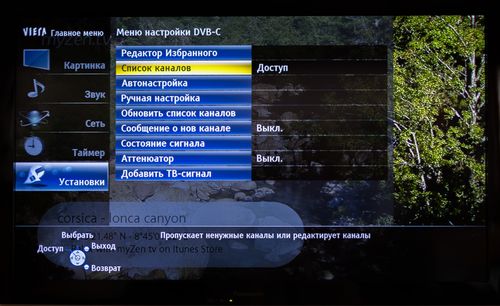 2. В появившемся меню, выберите вкладку УСТАНОВКИ. На этой вкладке выбираем пункт МЕНЮ НАСТРОЙКИ DVB-C, нажимаем кнопку ОК.